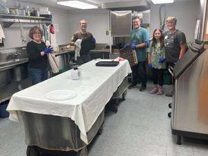 Other members of the team making the pork and sauerkraut meal at St. John’s UCC in Emmaus include Diane and Heinrich Krause and Phillip, Shane and Carly Gaugler working on their part of the dinner.
