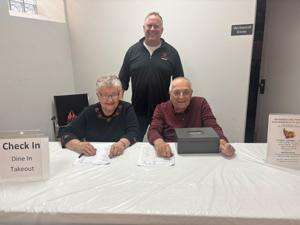 Doris and Paul Trumbauer with Pastor Dr. Paul Knappenberger, welcome those coming to the dinner.