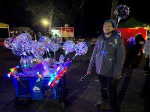 Tory DeAngelis, of Rainbows and Unicorns, displays his balloon creations at Alburtis Park during the Alburtis Holiday Festival. DeAngelis and his partner create these lit up balloons.