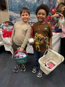 Ashton Grim and Jericko Brooks have full baskets and are ready to pay for their items. Then on to the wrapping station so family members and friends will be surprised.