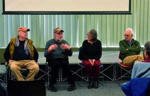 Press photo by Ed CourrierFrom left, Dave Fry, John Gorka, Bridget George and Doug Roysdon take turns answering audience questions during a Dec. 13 screening of “Rooted” at the Bethlehem Area Public Library.