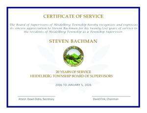 During the reorganization meeting, former supervisor Steve Bachman received a certificate of service from Jakum for his years of service to the township.
