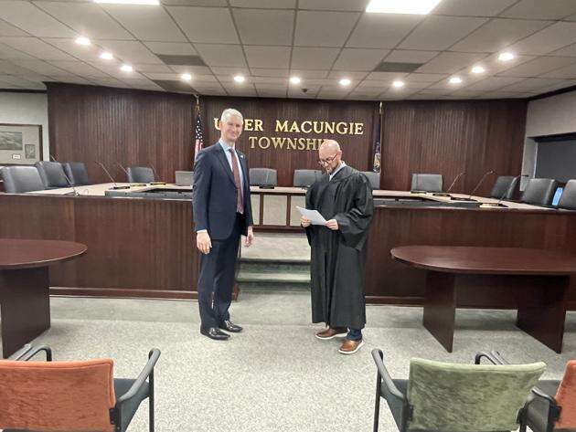 PHOTOS COURTESY of UPPER MACUNGIE TOWNSHIPJulien Godbarge is sworn in as vice chair of the Upper Macungie Township Board of Supervisors by Lehigh County Magisterial District Judge Michael Faulkner during the township’s 2026 reorganization meeting.