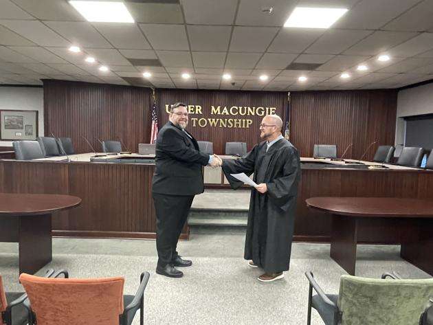 PHOTOS COURTESY of UPPER MACUNGIE TOWNSHIPBarry Bellew is sworn in as Upper Macungie Township tax collector by Lehigh County Magisterial District Judge Michael Faulkner at the township’s reorganization meeting.