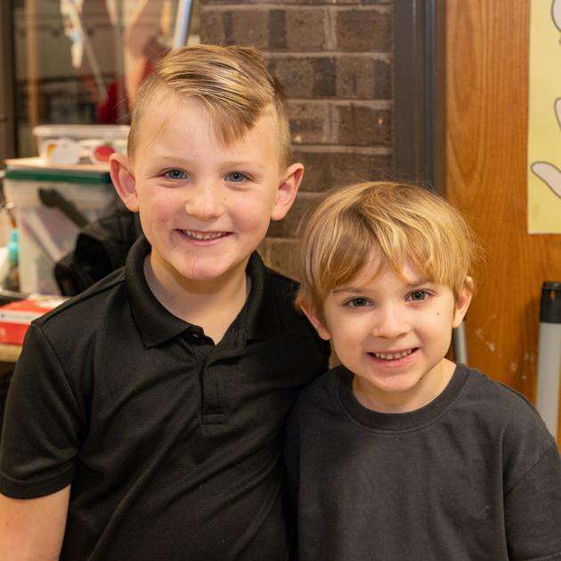 Kernsville Elementary School students Vincent Wilson and Jaxon Pyle are “Twins for a Day” during the Kernsville Elementary School Twins and Triplets Day.