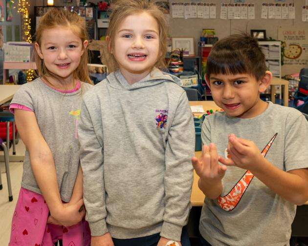 Hey, it doesn’t matter what we wear, we’re still best friends say Braylen Breedlove, Mason Brown and Ian Peters during the Kernsville Elementary School Twins and Triplets Day Jan. 6.