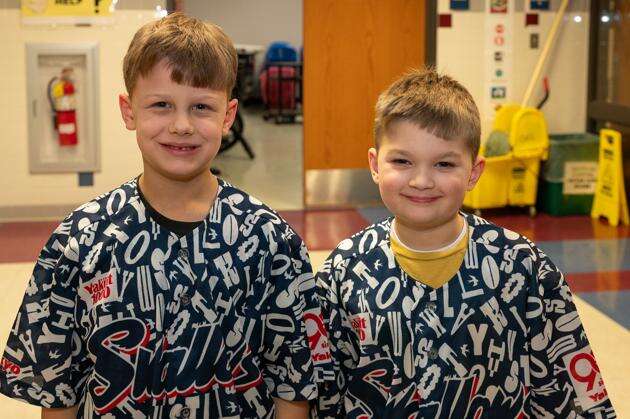 Sporting the same shirts, Patrick Rabe and Jaxon Pyle are “Twins for a Day” during the Kernsville Elementary School Twins and Triplets Day.