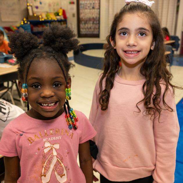 Pretty in pink are “twins” Zuri Jones and Kifan Hahna at the Kernsville Elementary School Twins and Triplets Day.