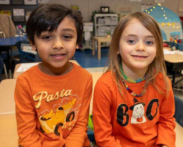 Sharing look alike shirts, Ayann Patel and Mary Lenneville, portray twins during the Kernsville Elementary School Twins and Triplets Day.
