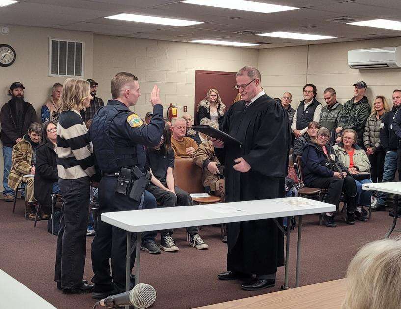 Officer Jarett Honea, accompanied by his wife, Klarissa, is sworn in by Magisterial District Judge Robert Hawke during the Jan. 13 Lehigh Township Board of Supervisors meeting.