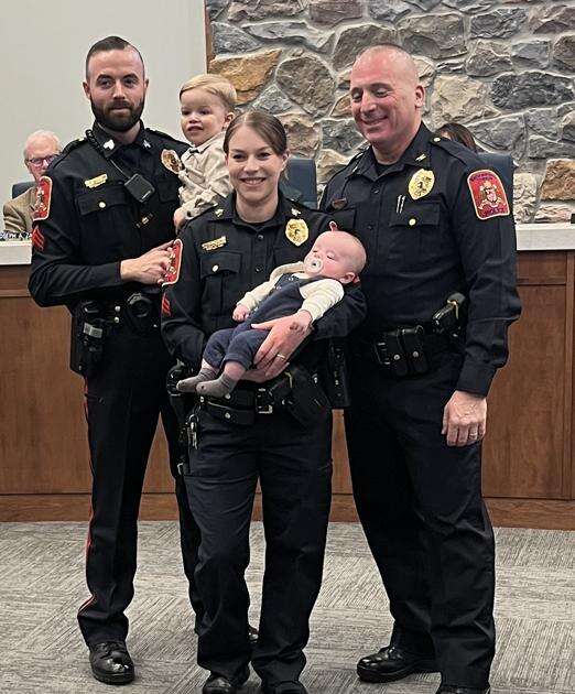 Commissioner Jacob Roth introduced Police Chief Frank Lombardo for a badge pinning ceremony recognizing two officers.