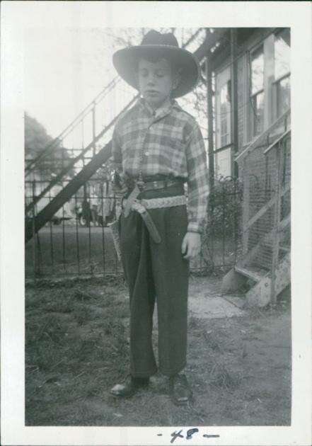 At age 8, my parents dressed me up as a cap-pistol John-Wayne-style Western gunfighter, but you can tell from my expression that I was the unlikeliest of warriors, yet now I have a sudden urge to hold an honest-to-god real gun in my hand.