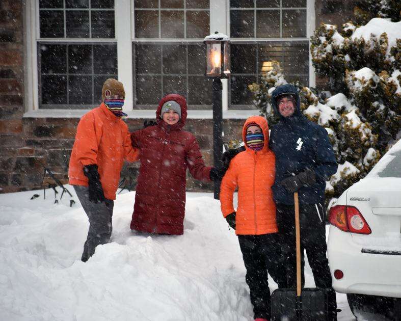 The Svencer family takes a break after shoveling their Walnut Lane driveway as the snow turns to sleet during Winter Storm Fern Jan. 25. From left are, Evangeline, Violet and East Penn educators Tina and Bryan Svencer. The older daughter attends Eyer Middle School and her sister attends Lincoln Elementary School.
