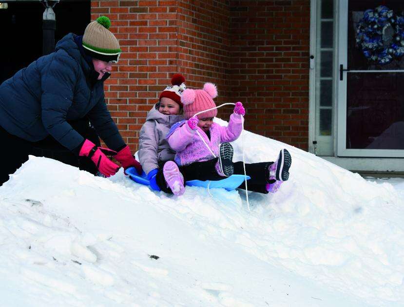 Walnut Lane mom Kate Leininger gives her daughters’ sled a gentle push on a drift in the family’s front yard Jan. 26. Natalie steers while Chloe rides along behind her.
