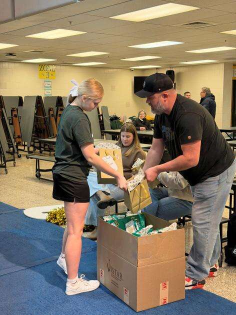 Cheerleader Kailey Keiser and her family prepared gift bags for each of the coaches and cheerleaders. The bags were tagged with inspirational words and included items the girls could use for their trip. Cheer Dad Nick Keiser brought the box of gift bags and assisted his daughter as she provided each member of the team with a bag of swag.
