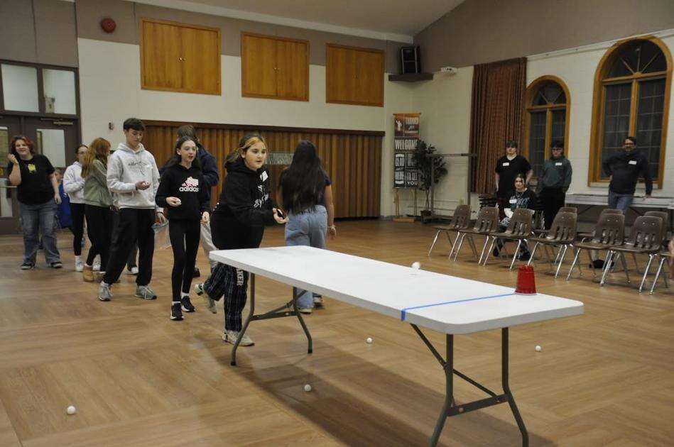 Everly Carais is using a ping-pong ball to knock the cup off the table. Waiting to take their turn is Alicia Hufgard and Caleb Brown.