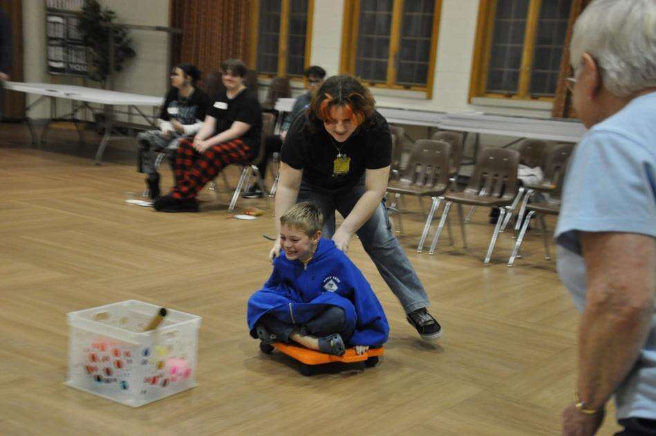 Jacob Gravatt gets a push from another youth attending the Jordan UCC’s Koinonia Group physical and mental challenges.