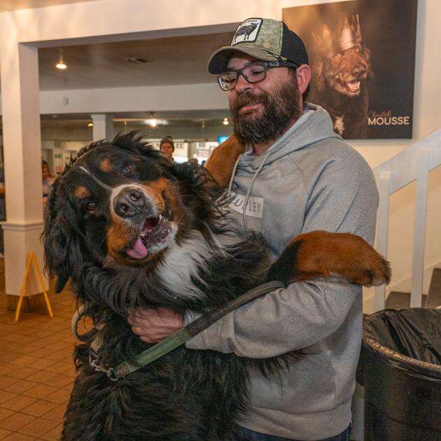 Tim Kristie, of Mertztown, has his hands full of dog, his 3 1/2-year-old Bernese Mountain Dog when they visit the Sanctuary at Haafsville Puppy Bowl.
