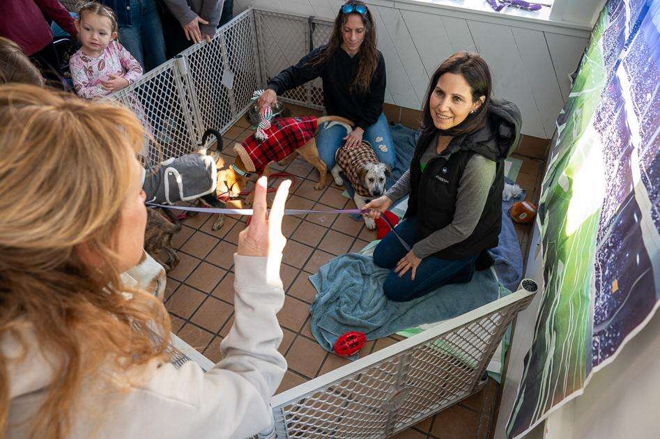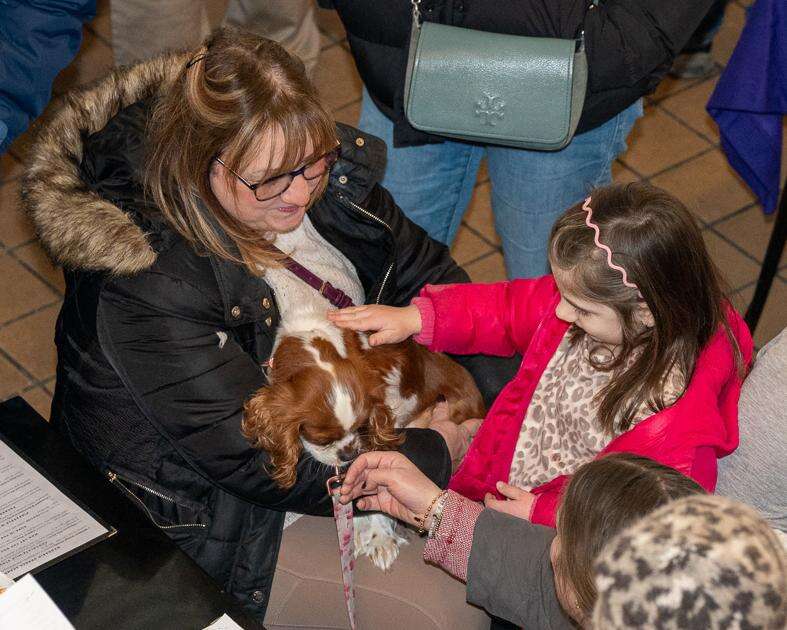 Jocelyn Brown, of Alburtis, visits Wendy Furbur and “Merido” during the Sanctuary at Haafsville Puppy Bowl.