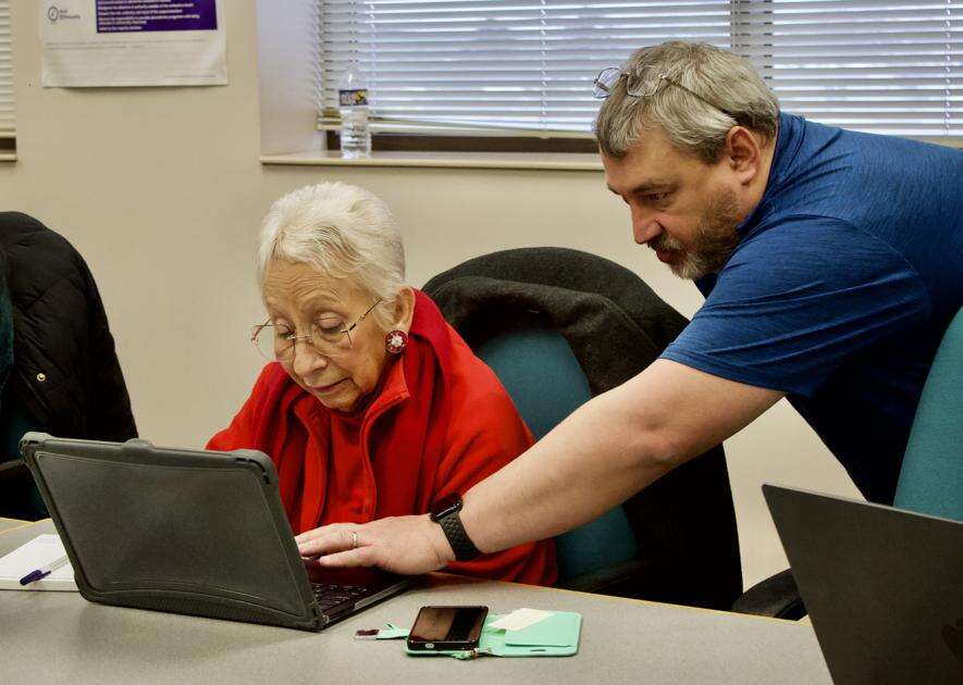 Freida Mercado gets an assist from computer technician Thomas Smith as she learns to navigate Google Calendar.