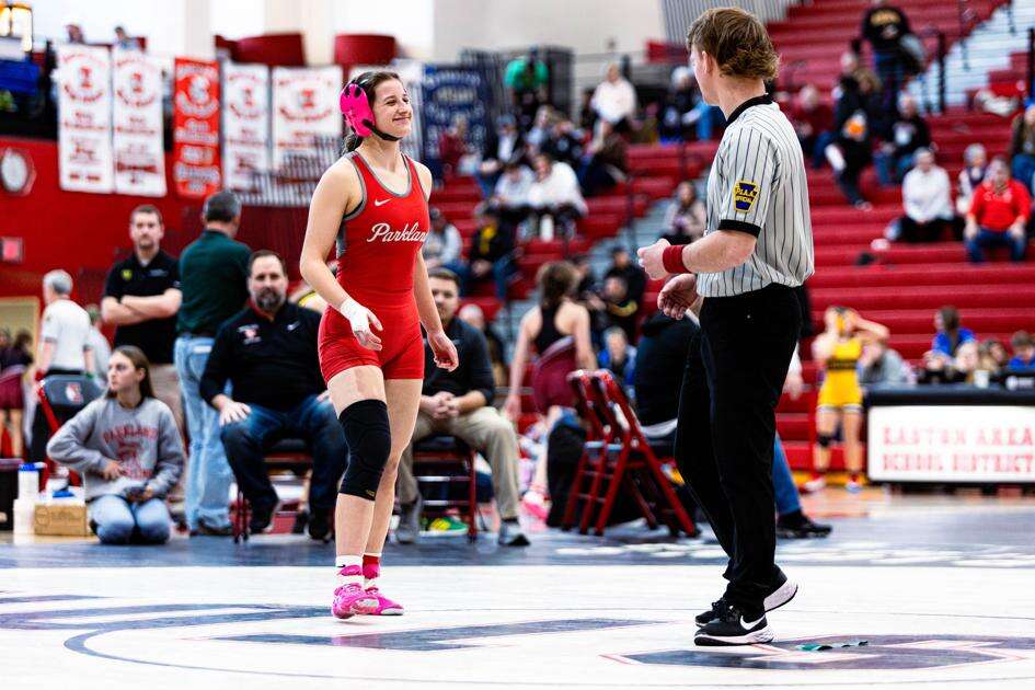 Parkland sophomore Peyton Schneck wrestled four bouts in the 106-pound bracket. She won all four by fall in the first period of each match, putting Northampton’s Emilee Gaughran on her back in 1:49 in the title bout.