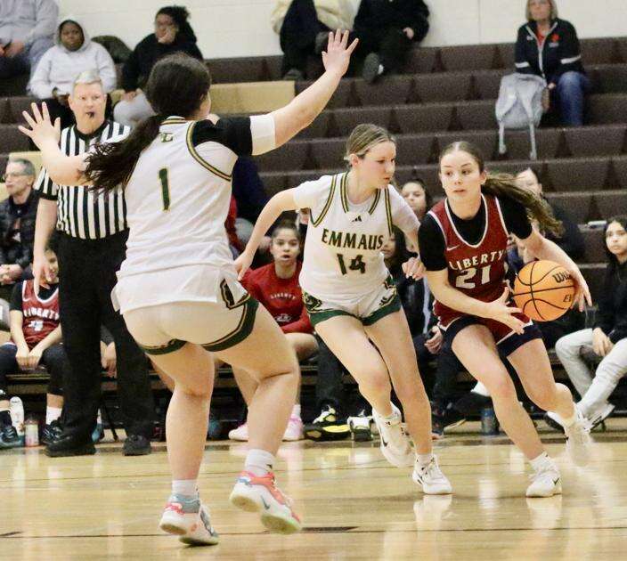 Press photo by Linda RothrockLiberty’s Emma Miller tries to get around an Emmaus player during opening-round action of the District 11 playoffs.