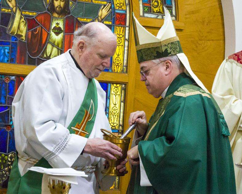 Left to right: Deacon Michael Laroche of Holy Trinity Roman Catholic Church, Whitehall, and Allentown Bishop Alfred A. Schlert during the re-dedication ceremony.
