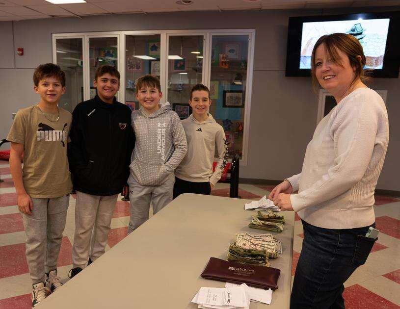 Jonah Lunger, Beau Bauer, Denton Stephens and Brennan Yerger sign in with para-professional Sara Gaeta for the Orefield Middle School dance.