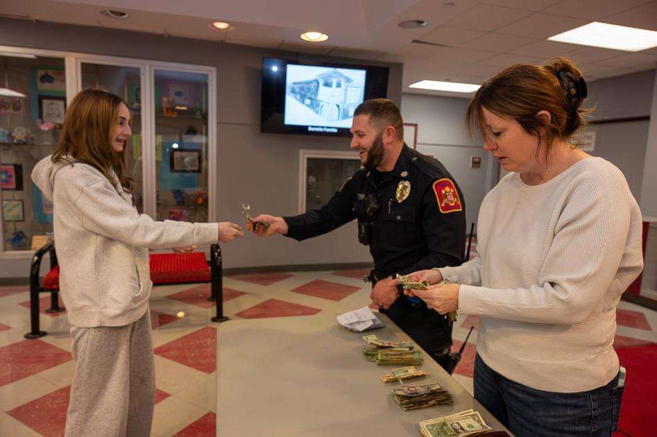 PRESS PHOTOS BY LOU WHEELANDParkland School Resource Officer Tyler Bachman and para-professional Sara Gaeta welcome student Claire Czura to the Orefield Middle School dance held recently in the gymnasium and cafeteria.