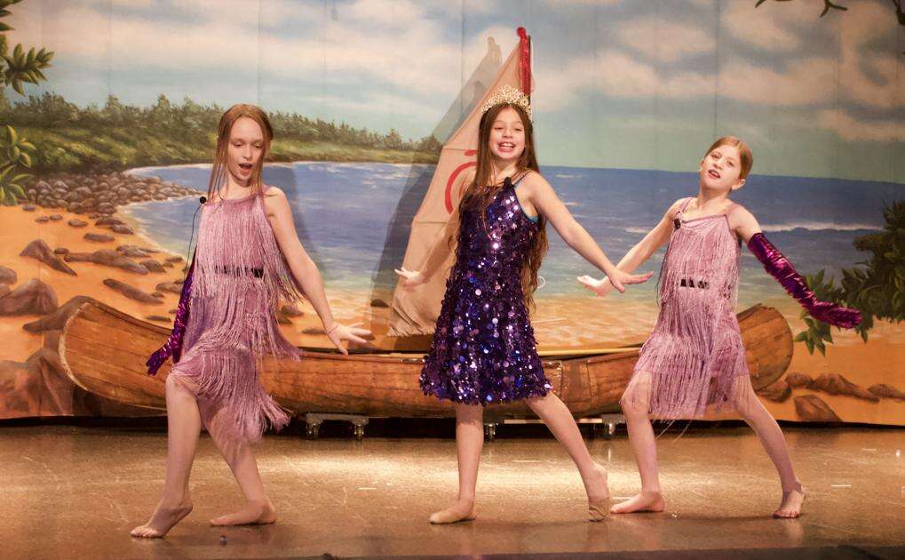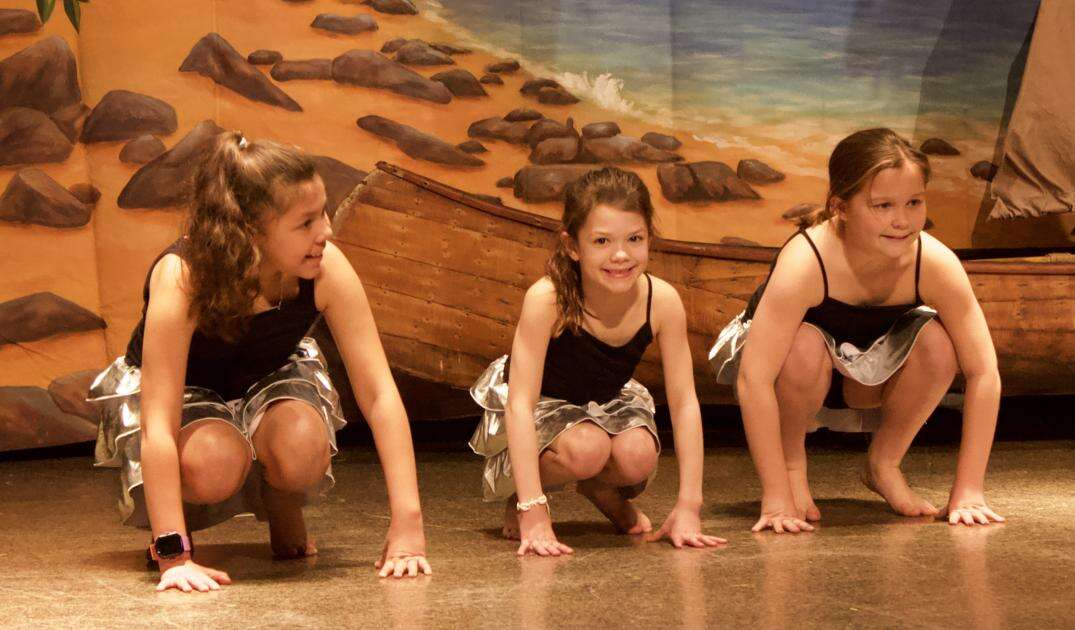 Emma Sanchez Tejeda, Emily Seibert and Emma Fox are ready to spring into action as “Shiny Dancers” in “Moana JR.” at Willow Lane Elementary School.