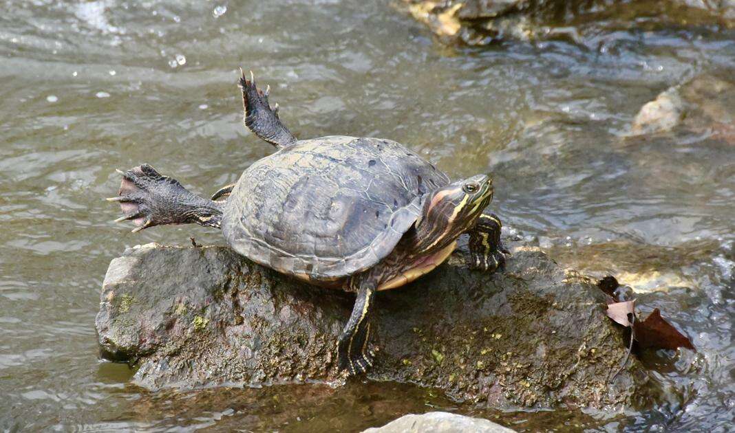 Press photo by Dana GrubbWarmer temperatures had this turtle perched on a rock in the Monocacy Creek in Monocacy Park March 8 It was apparently trying out some yoga stretches and working on its rock balancing after a cold snowy winter.