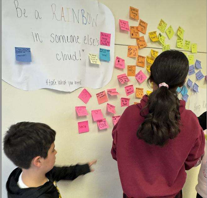 Members of the club place positive notes on the wall. Students were encouraged to take a note to help keep them happy and motivated during the day.