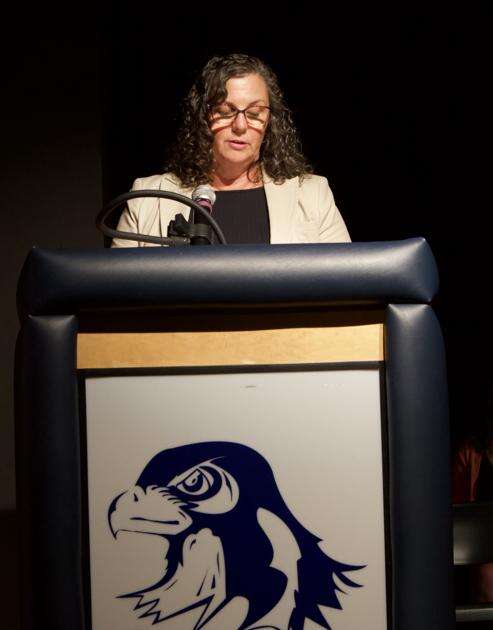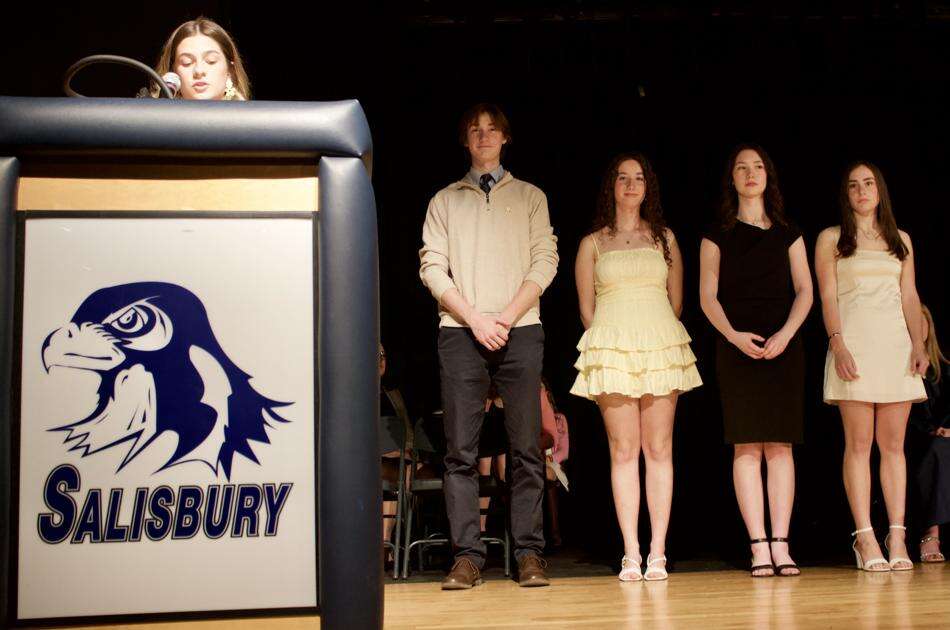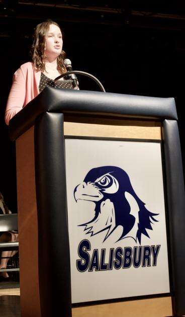 Press Photos by Kathy HassickSalisbury High School students were inducted to National Honor Society March 19. ABOVE: National Honor Society adviser Megan Basile welcomes the families and friends of 38 students who embody the four pillars of the National Honor Society --- scholarship, leadership, service and character. The National Honor Society induction ceremony was held in the auditorium at Salisbury High School.