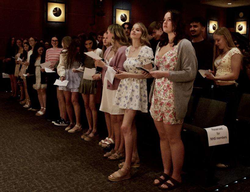 Current members of the National Honor Society in unison with the newly inducted members pledge to uphold the NHS four pillars of scholarship, service, leadership and character.
