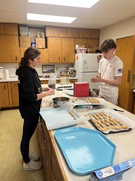 Left: Marina Breininger and Travis Schultz assist with the Easter candy making.