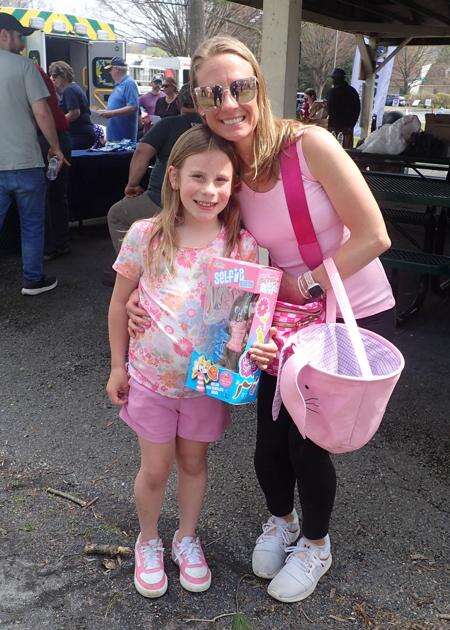 Paige Knoll takes home a candy rabbit with the help of her mom Christine. Any egg hunter lucky enough to find a gold coin in one of their eggs receives a bunny prize.