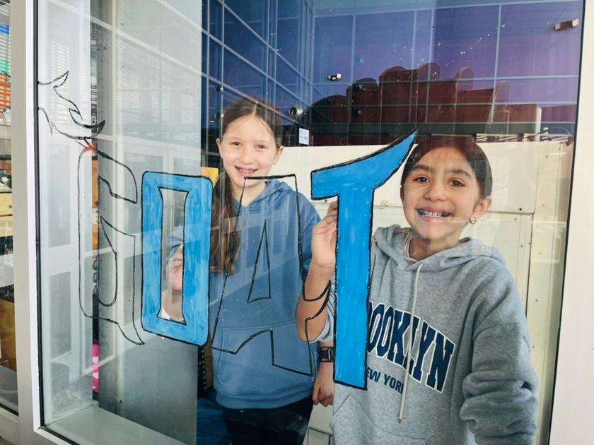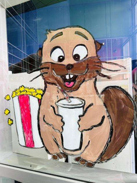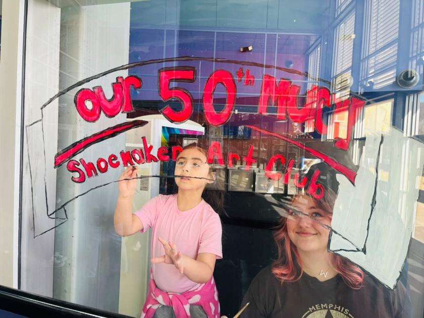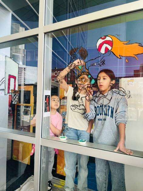 Zoé Husted and Konstantina Van Vorst work on the mural signature with Shoemaker Elementary School art teacher and club mentor Jeff Shreck close at hand. The mural projects have decorated the lobby windows at the multiplex since 2008.