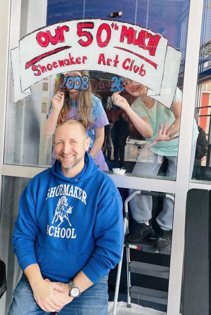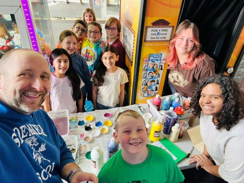 The artists gather for photo with Shoemaker Elementary School art teacher and club mentor Jeff Shreck and two alumni of the club who helped on mural day. Pictured are, top, from left, Maya Ordonez, Emma St. Clair, Maverick Lienert, Zoé Husted, Evan Stek, Nolan Stek and Chloe Correnti; bottom: art teacher Jeff Shreck, student Jonathan Shreck and Emmaus High School students and art club alums, Maycen Bunner and Ariel Bayard.
