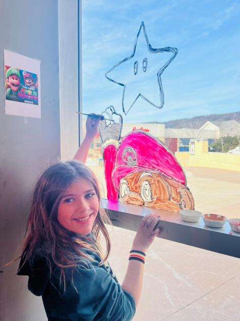 Student muralists in the Shoemaker Art Club recently reached a milestone, completing the club’s 50th mural at AMC Center Valley 16 multiplex. The mural showcased the animated features “G.O.A.T.” “Super Mario Galaxy” and “Hoppers.” ABOVE: Chelsea Wentzel appears with character Rosalina of “Super Mario Galaxy.”