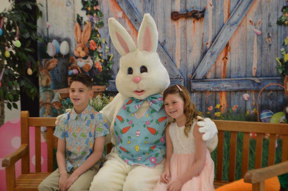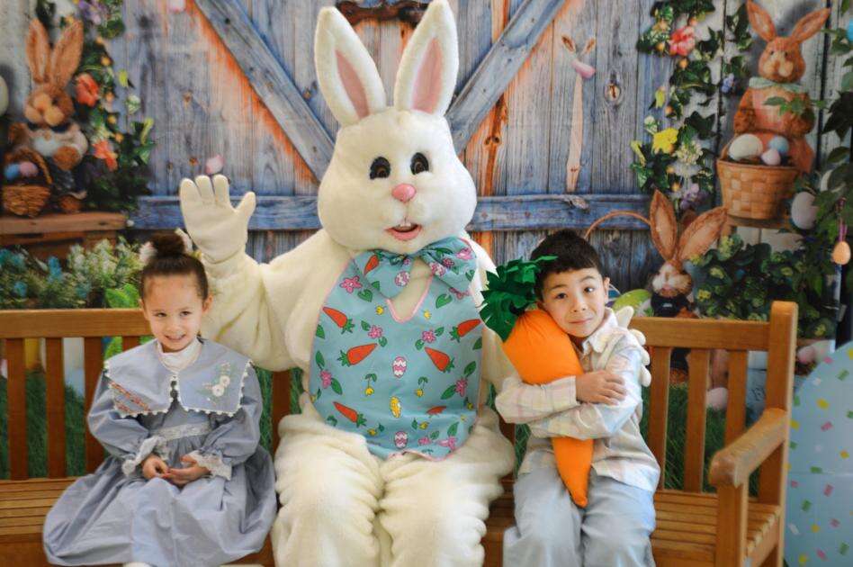 Jenson Brixius and sister Joliet are all smiles while sitting on either side of E.B., aka the Easter Bunny.