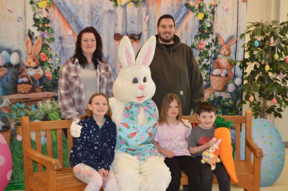 Mom Kyla and dad Anthony Hernandez stand for a festive photo with their children, from left, Emily, Autumn and A.J. and the Easter Bunny.