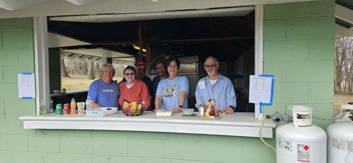 ABOVE: Louise, Cindy, Lisa, and Wayne, (back) Jim and Pastor Alex man the concession stand serving hot dogs and funnel cakes to hungry egg hunters.
