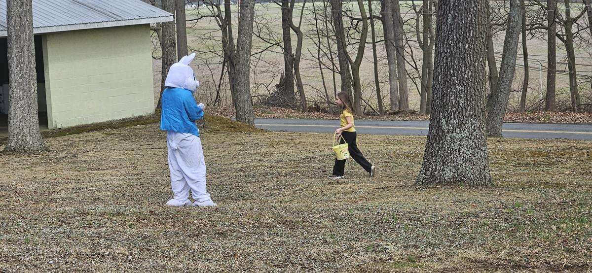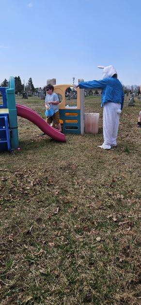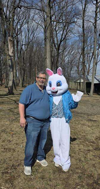 PRESS PHOTOS BY TABITHA SCHADEMorgenland Union Church, Orefield, held its annual Easter Egg Hunt April 4. ABOVE: Pastor Alex takes a moment to stand with the Easter Bunny in between hiding eggs.