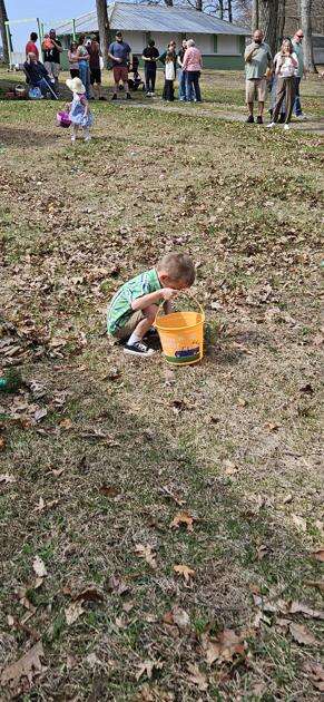 LEFT: Kids at the Morgenland Union Church Easter Egg hunt fill their baskets to the brim with both real and plastic prize eggs. The eggs were hidden across the church grounds and cemetery.
