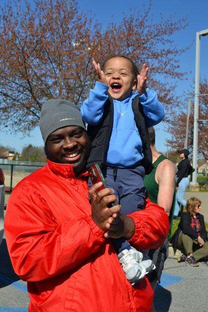 Nasiyus, held by Taheina Johnson, cheered on all the runners waiting for dad Jeanmarc Nonirt, of Allentown, to cross the finish line. Deziaya Henry held the poster while all three cheered for Nonirt who completed the race in 32:38.