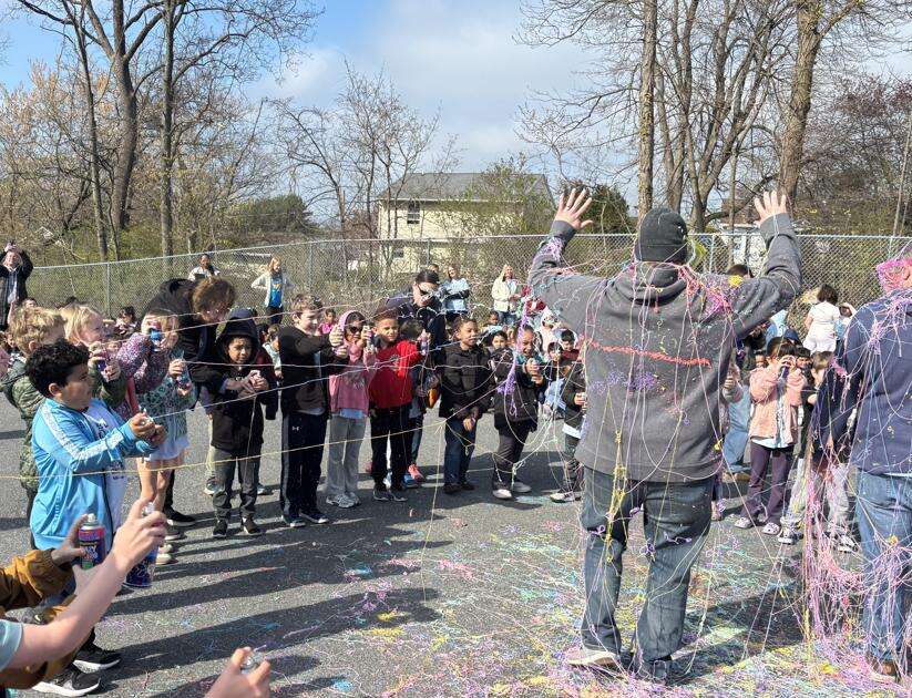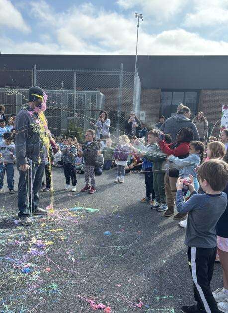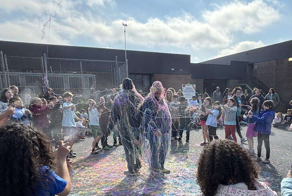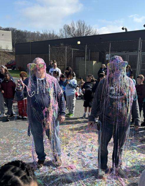 Press Photos by Rebecca FoehrkolbSalisbury Elementary School Principal Zach Brem and Assistant Principal Brian Muschlitz got silly string bombed April 10 to celebrate students reaching their fundraising goal in the school’s Coin Battle fundraiser. Five students from each classroom were chosen to spray Brem and Muschlitz. ABOVE: Students in kindergarten blast Brem and Muschlitz with “Silly String,” a popular toy from the 1970s.