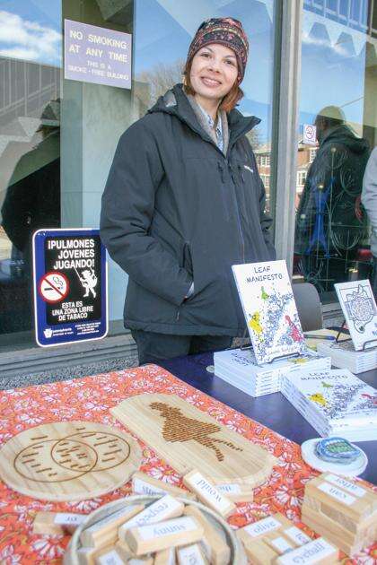 Reading resident and author Laurel Radzieski, owner of Eat More Poems, displays her new book, “Leaf Manifesto,” described as “a guide to treehood for anyone interested in being a tree, being a woman, or being alive.” Radzieski’s also has more physical experiments with poetry, scored on wood and words on labeled blocks.