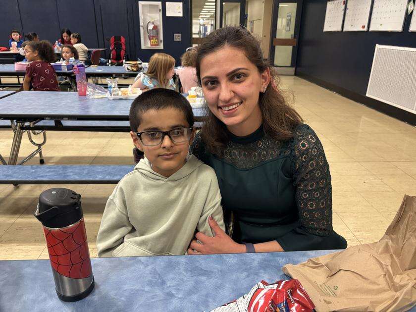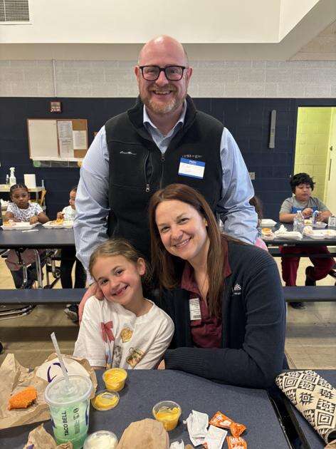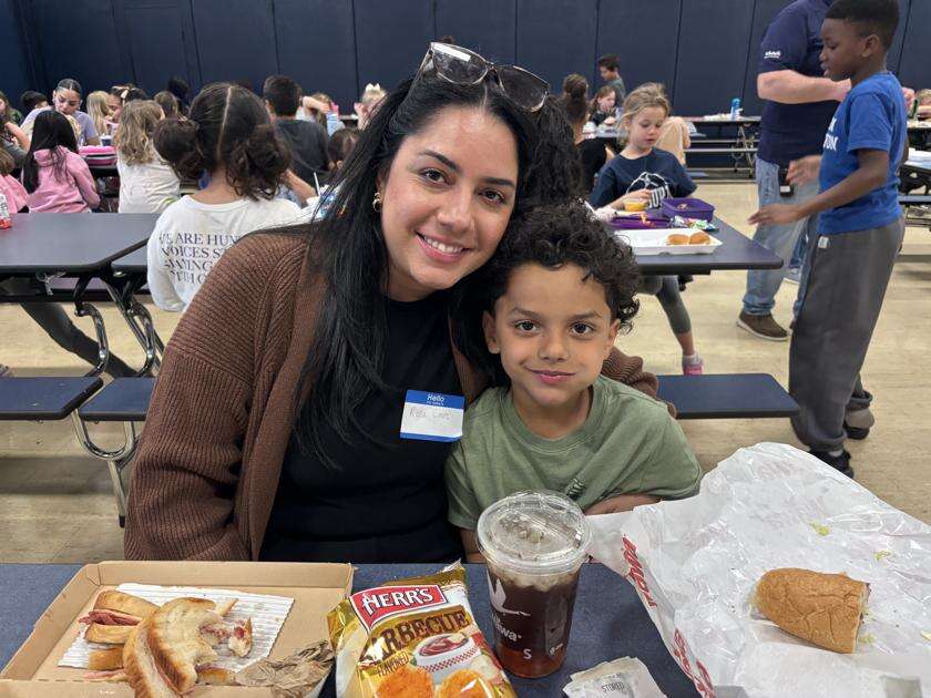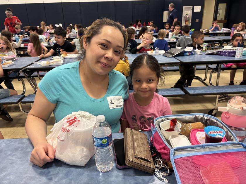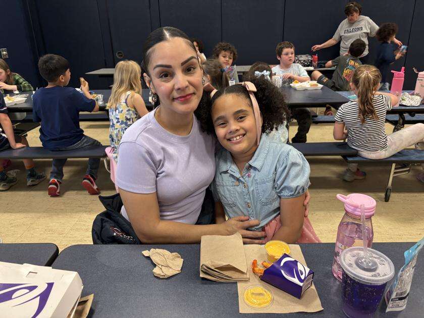 Press Photos by Rebecca FoehrkolbParents and guardians joined their Salisbury Elementary School students for lunch April 13. Students can “purchase” lunch for 100 Falcon Feathers. ABOVE: Maria Ramirez and Camila Flores enjoy lunch together.