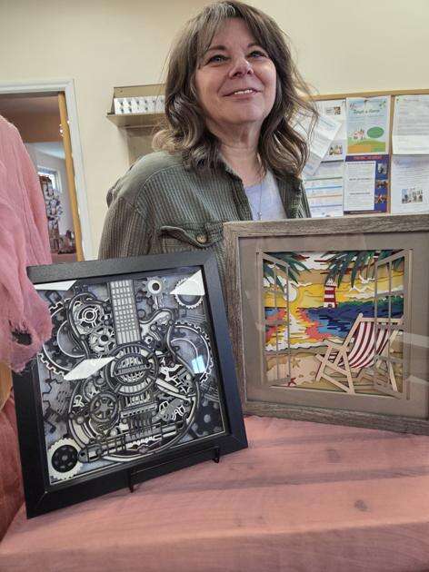 Custom shadow and light boxes are Shellie Vlcek’s creations using card stock and an electric cutting machine called Cricket.