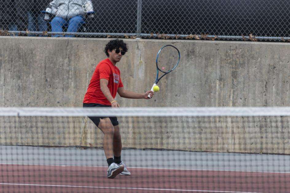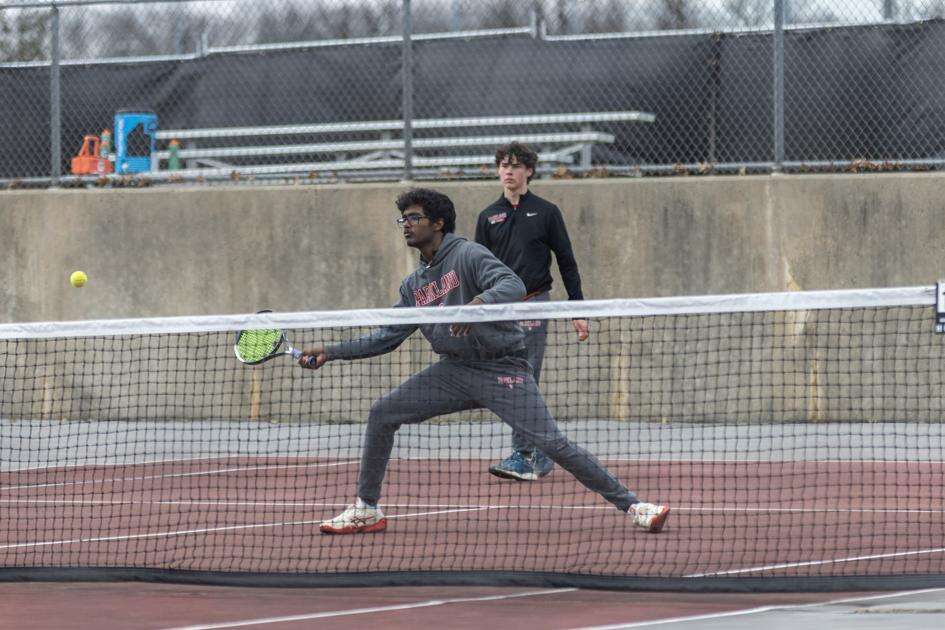 PRESS PHOTO BY GRACE DEPPEPranav Senthilkumar plays the net while doubles teammate Noah Elijovich guards the back line.